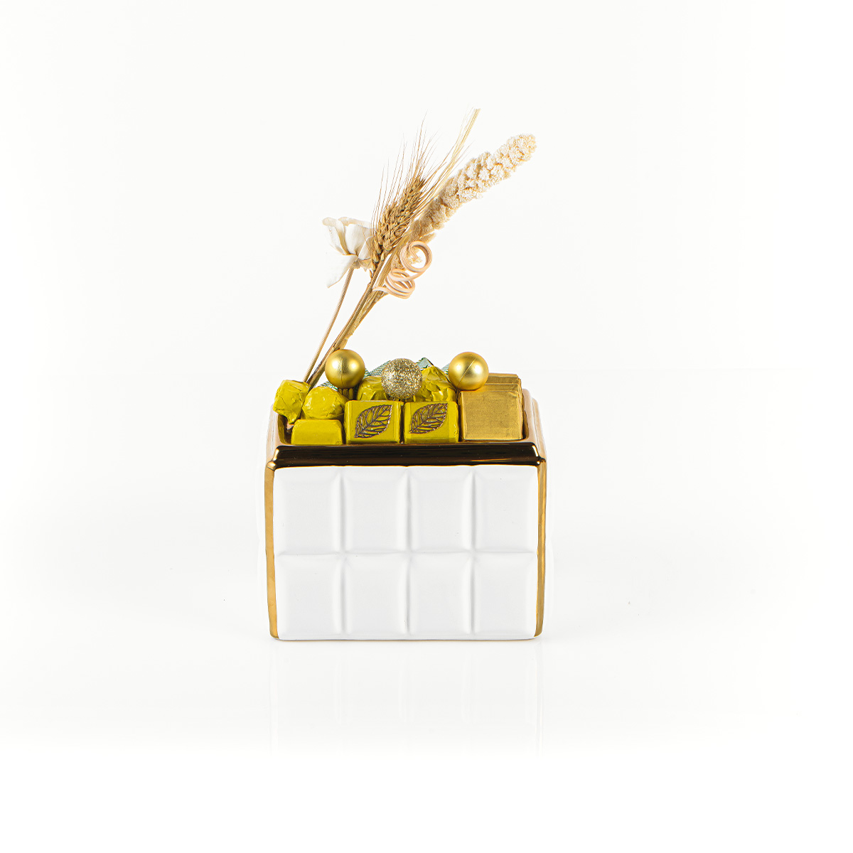 Sublime vase en céramique ambré, garnie d’une somptueuse sélection de chocolats